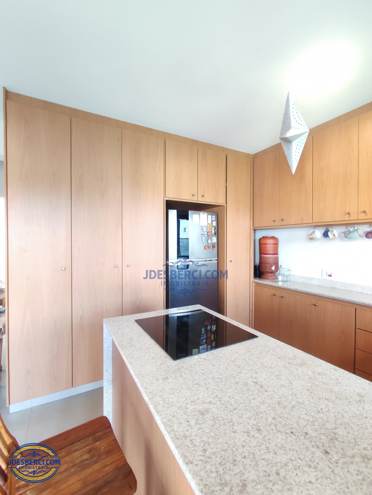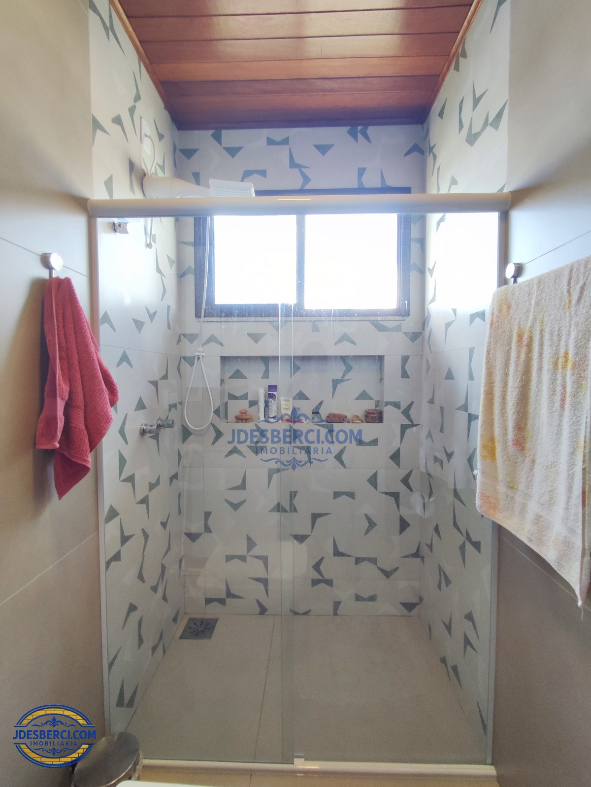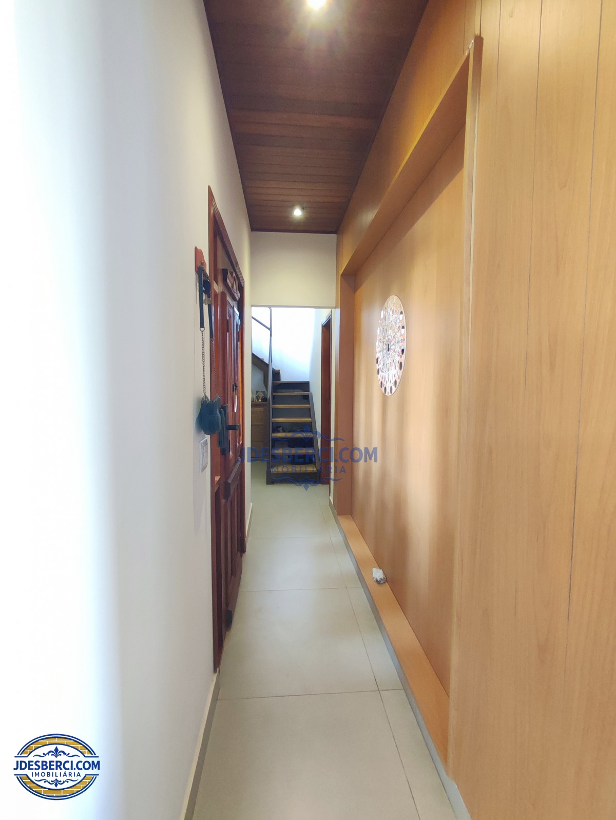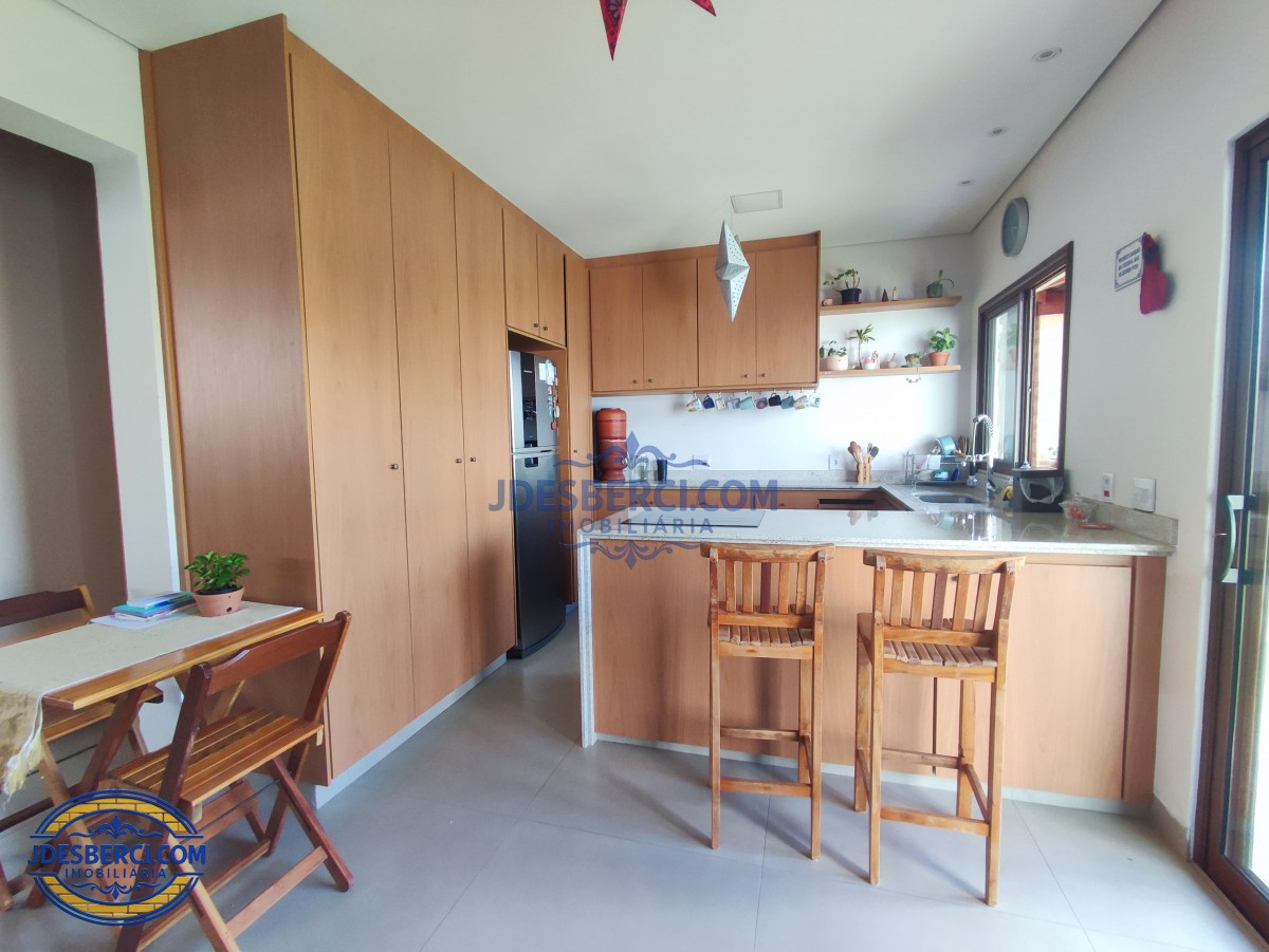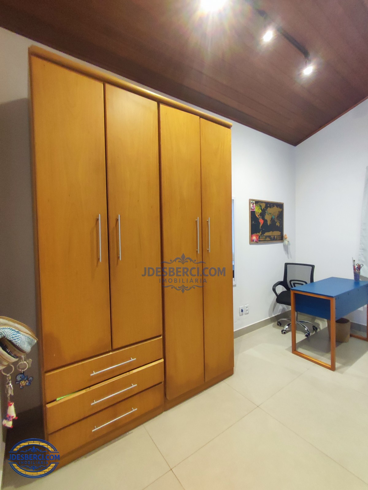 No pavimento térreo, a residência conta com sala, copa e cozinha integradas, com pé-direito alto e forro em madeira, criando um ambiente amplo, iluminado e muito acolhedor. A cozinha é completa em armários, além de um banheiro social completo, um dormitório estrategicamente localizado em frente ao banheiro e um hall que harmoniza os ambientes entre a sala e o dormitório.