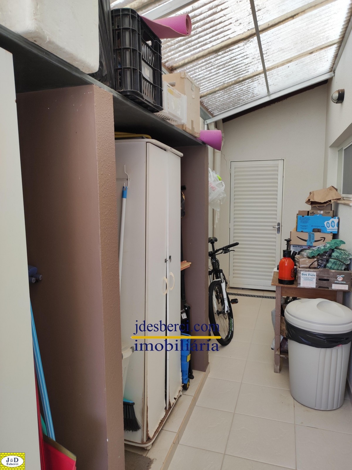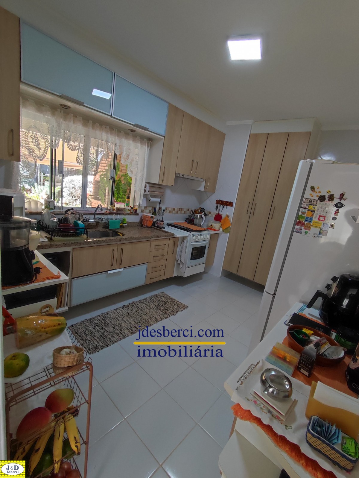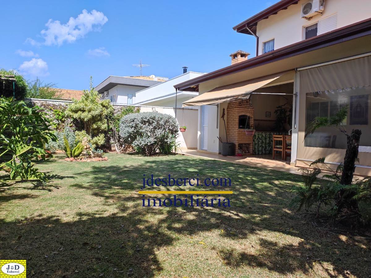 Área de churrasqueira com espaço amplo acoplado a uma varanda, com vista para o quintal, onde possui várias árvores frutíferas e espaços gramado; Área de lavanderia e armários de parede para guardar materiais; Garagem para dois carros.